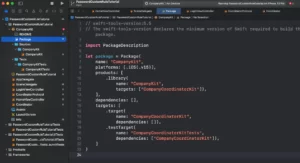 )Look closely for the changes. We added a new “.target” and a new “.testTarget” entries. Those are the definition of our new module CompanyLoginKit. This module will have only one file but you can have as many as you need. We also updated the “.library” key with the newly created module.